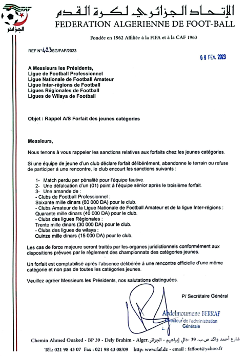| Courrier de la FAF Réf. N° 423/SG/FAF/2023 du 08.02.2023