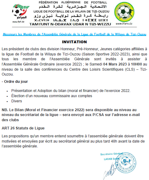 Les présidents de clubs des divisions Honneur, Pré-Honneur, Jeunes catégories; affiliées à la ligue de Football de la Wilaya de Tizi-Ouzou (Saison Sportive 2022-2023), ainsi que tous les membres de l'Assemblée Générale sont invités à assister aux travaux de l’Assemblée Générale Ordinaire (exercice 2022) ; le Samedi 04 Mars 2023 à 10H00 au niveau de la salle des conférences du Centre des Loisirs Scientifiques (CLS) – Tizi-Ouzou.